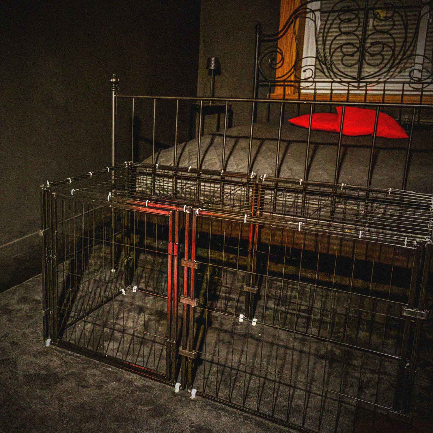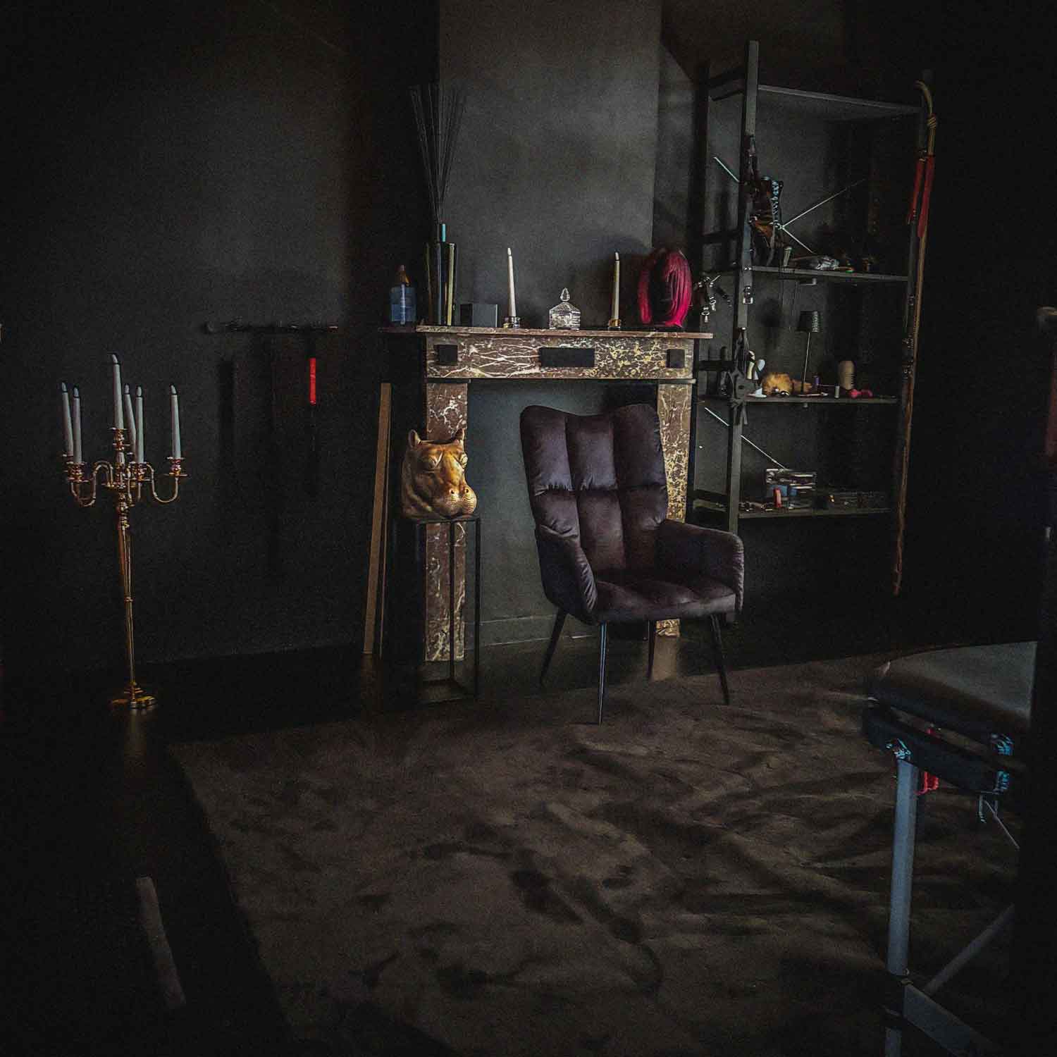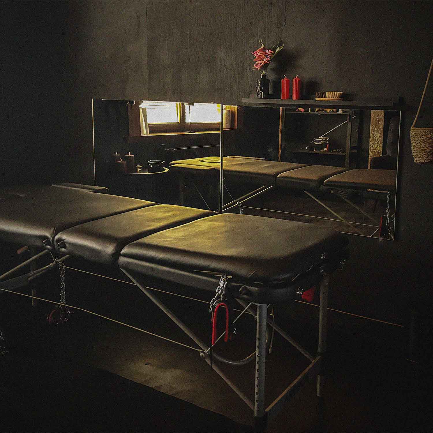 Whips, crops, ropes, cuffs, cages, candles, crosses, and bondage benches — each piece of furniture plays a role in a precise mise-en-scène, where the body becomes offering and silence becomes discipline.